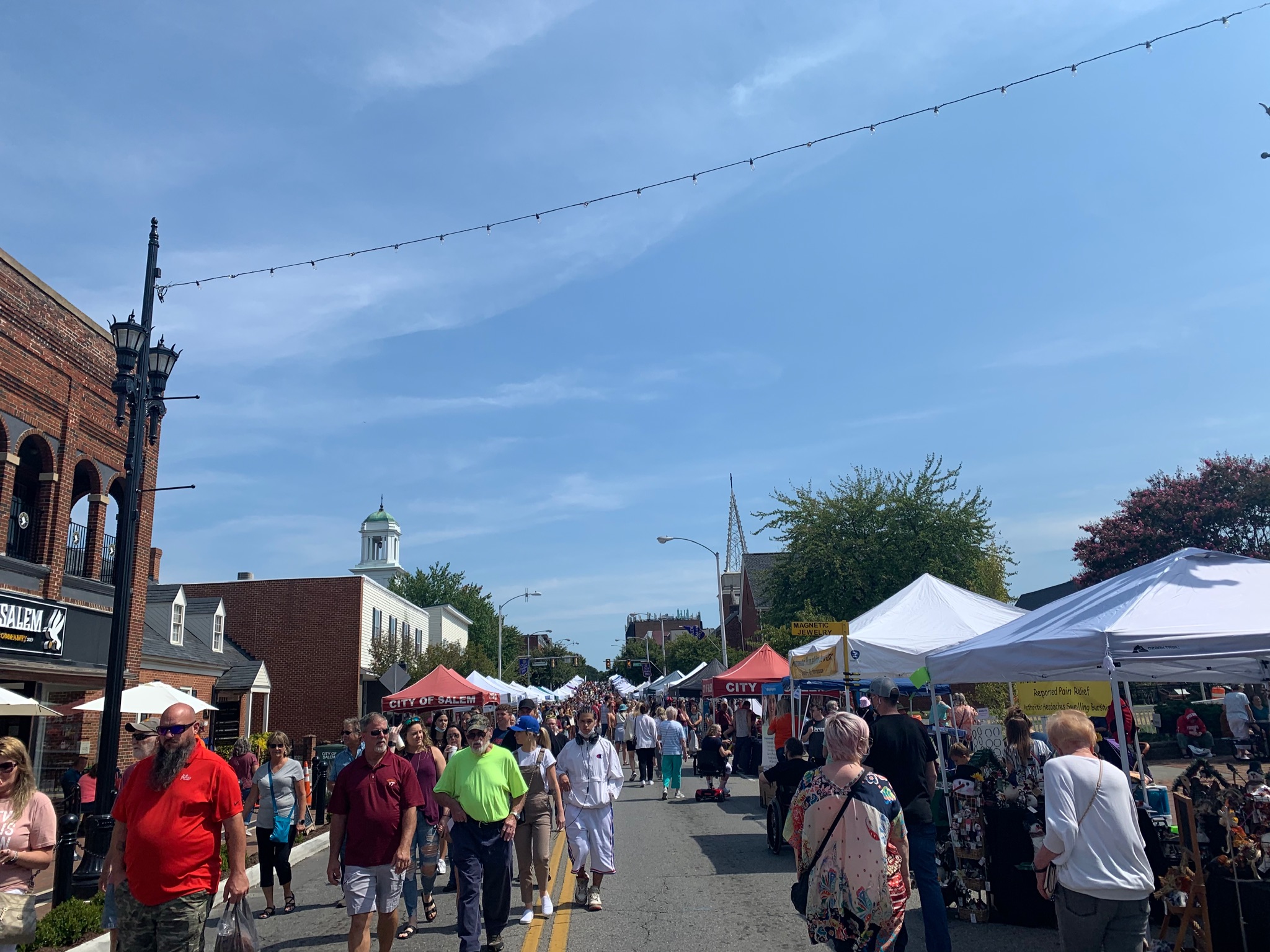 Numerous people and tents fill Main Street in Salem during Olde Salem Days